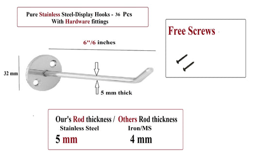 Q1 Beads 36 pcs. 6 inch Stainless Steel Wall mount Display Hook Hanger for Showroom/Mobile Shop/Wall Mount/Clothes