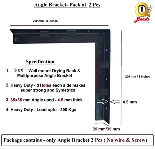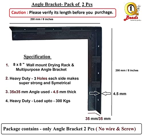 Q1 Beads 2 Pack 200 mm Metal Heavy Duty 300 kgs Capacity Wall Mount Angle Bracket L Bracket Industrial Grade for Drying Clothes ,Wall Shelf, Shop, Showroom, Rack - Multipurpose (8 x 8 inches , Powder Coated)