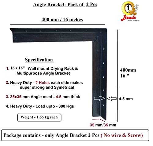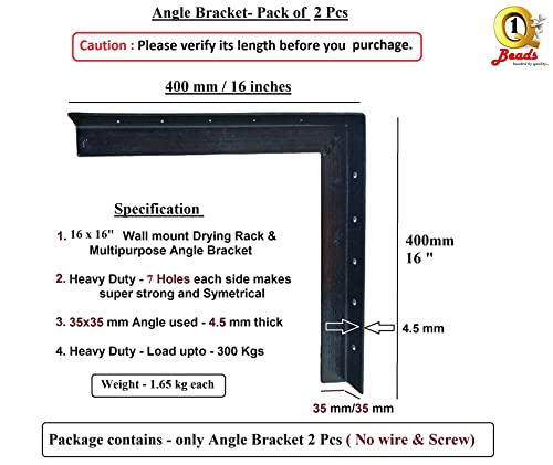 Q1 Beads 2 Pack 400 mm Metal Heavy Duty 300 kgs Capacity Wall Mount Angle Bracket L Bracket Industrial Grade for Drying Clothes,Wall Shelf, Shop, Showroom, Rack - Multipurpose (16 x 16", Powder Coated)